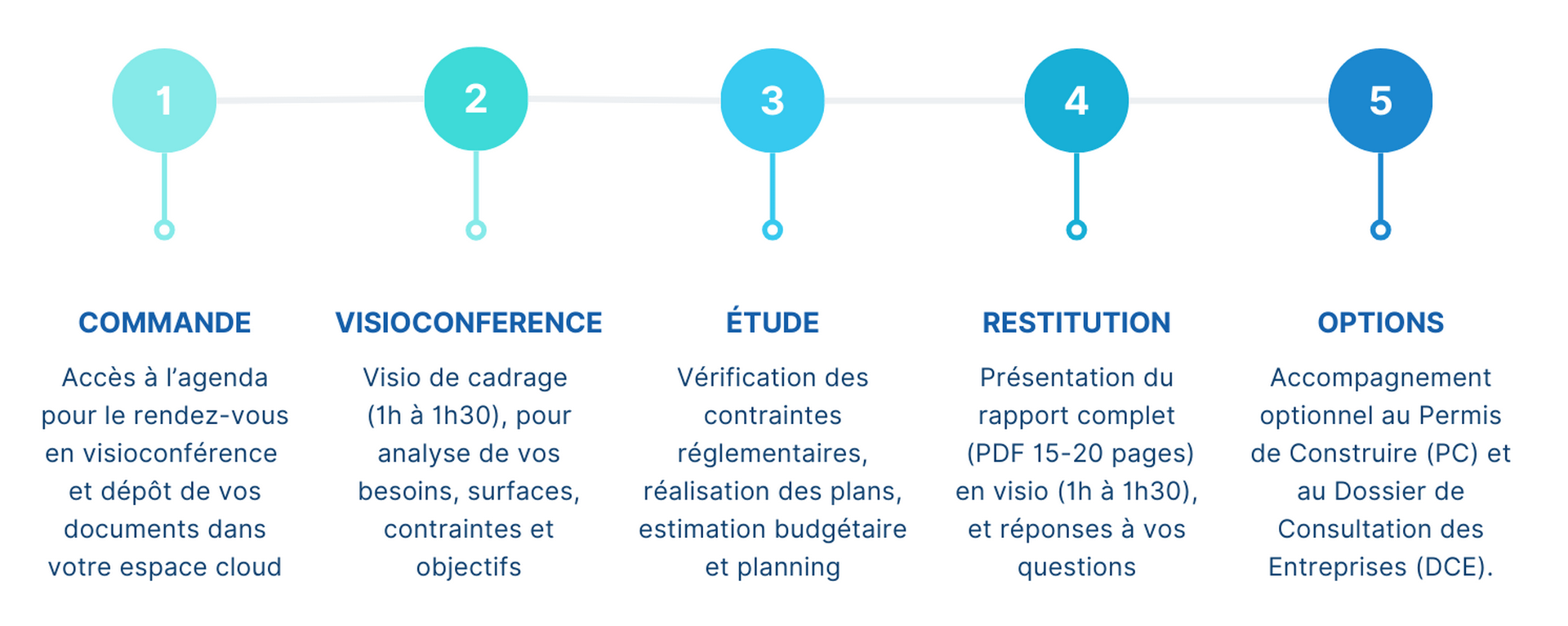 En 15 jours, obtenez : Analyse réglementaire + urbanisme + plan d'implantation + budget & planning prévisionnels.
